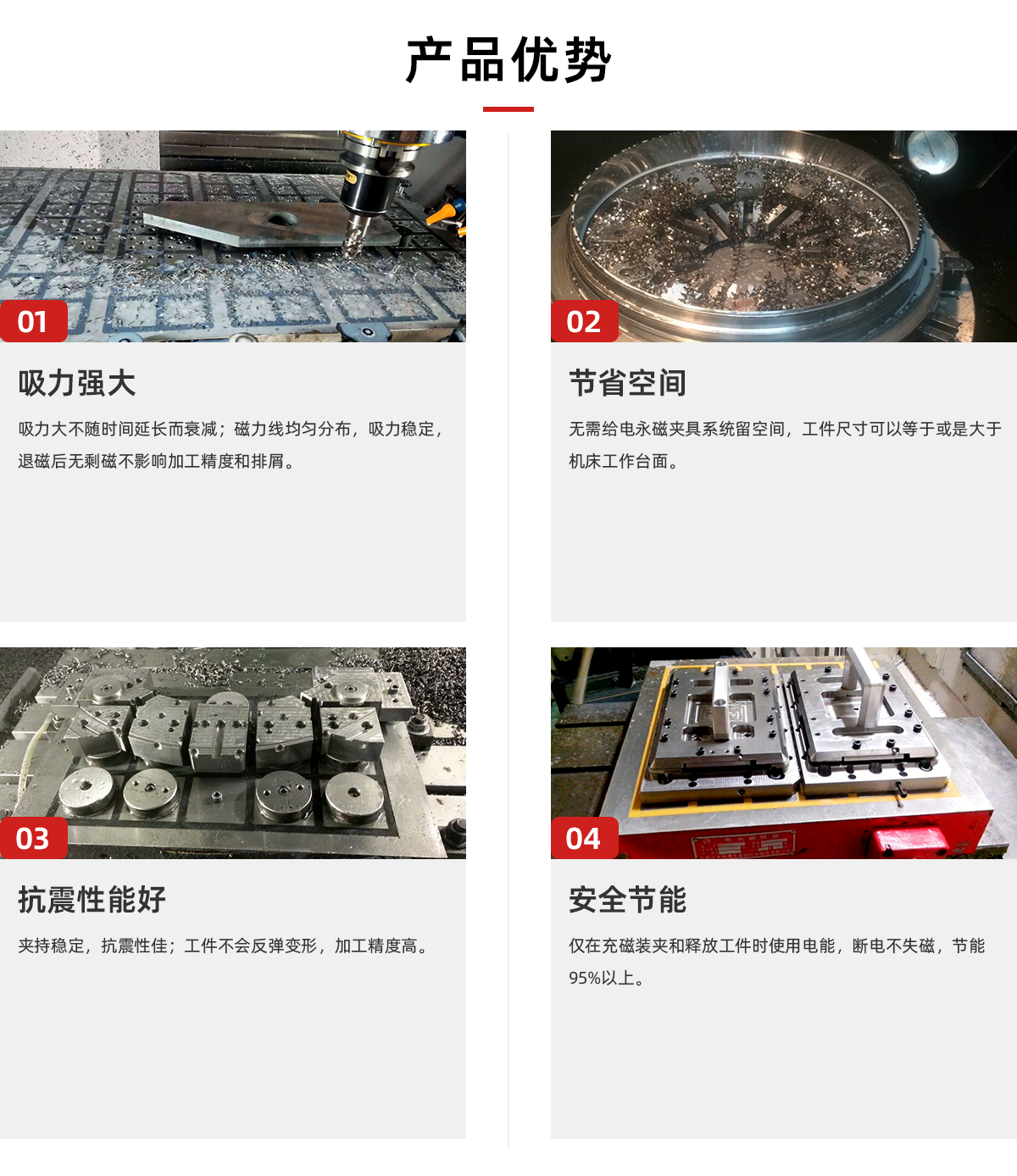产品特点:加工精度高,吸力强大,断电不断磁,全金属表面,防水结构,防止切削液进入,,安全可靠,节约能耗,操作简单等。